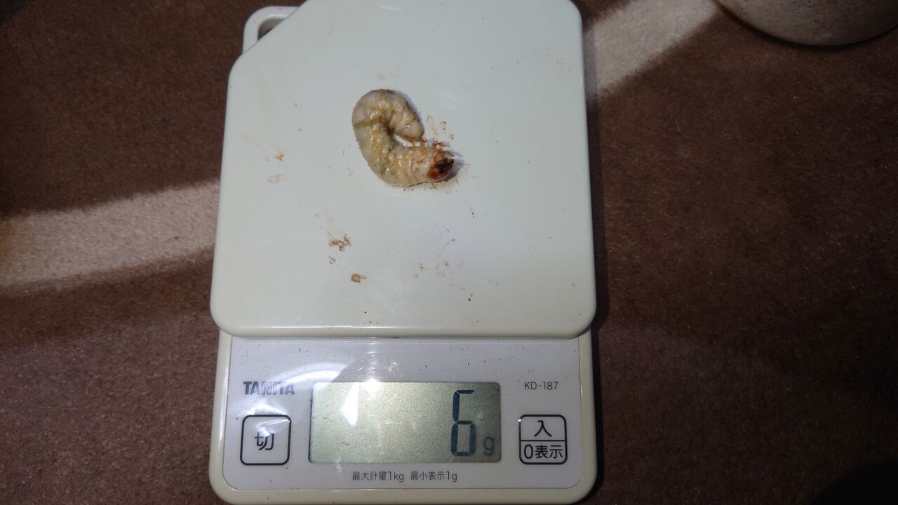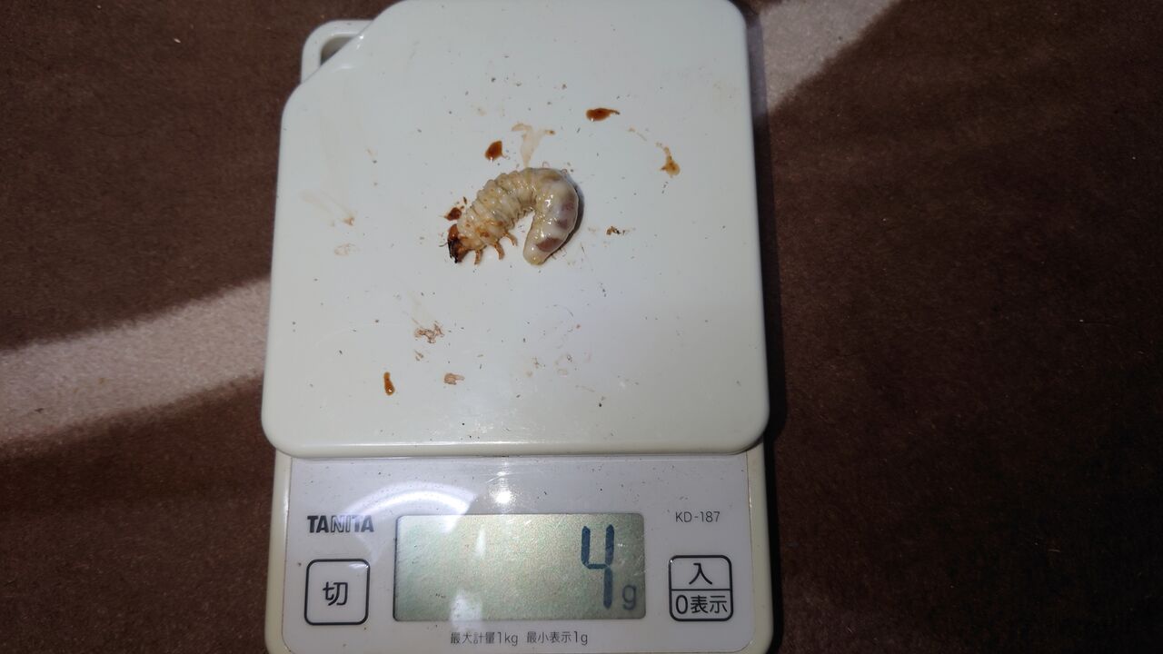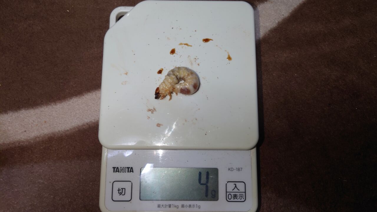 もう1頭は唯一習くわさんのエノキオオヒラタケに入れた個体なのですが4月30日にアロー原名と一緒に交換したところ、明らかに成長不良で2gしか無かったので他の幼虫たちと同じ菌糸に入れました