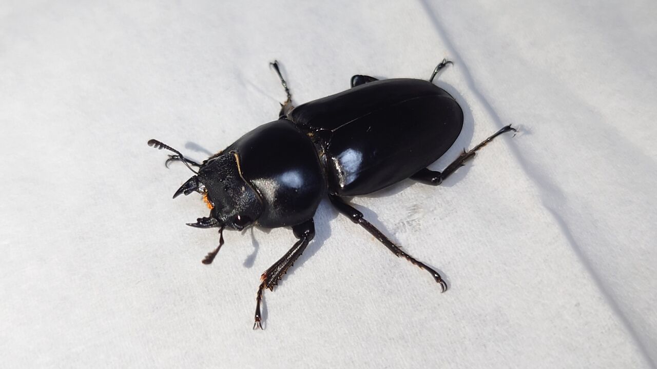 光量が足りないのでわかりづらいですが真っ黒ですねついでに言うとオスも上翅がほんのり赤いだけで前胸より上は真っ黒です