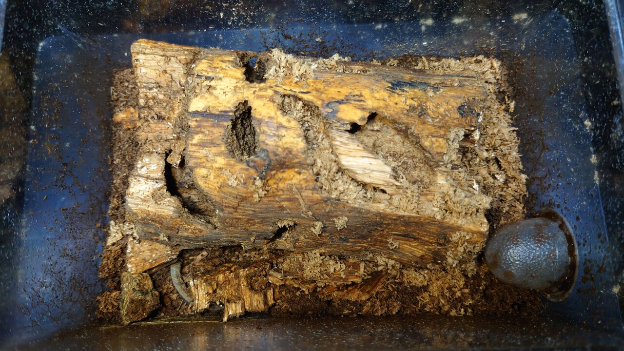 材はこんな感じで削り痕や食痕でだいぶ中身がなくなってきていました